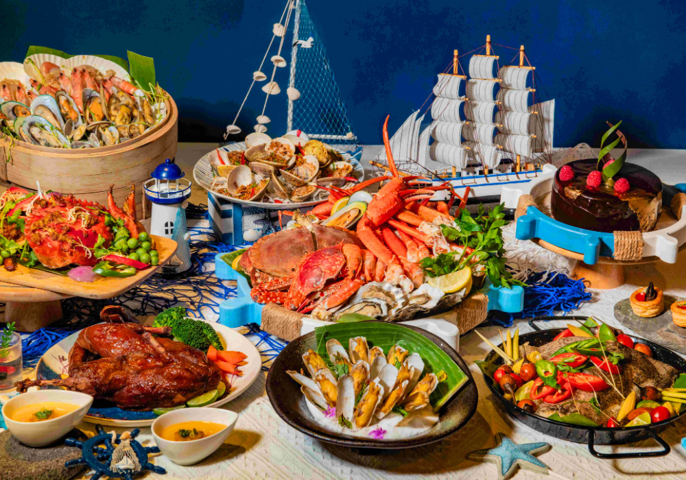 Embark on a global culinary voyage inspired by the ocean! A sumptuous spread of international seafood and global delicacies, featuring freshly shucked oysters, Canadian snow crab legs, pan-seared duck foie gras, and a variety of themed desserts. Discover a world of flavors and set sail on a gourmet journey across the seas.